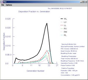 • Detailed output reports with complete deposition and dosimetry information available by individual, by lobe, by respiratory region, by airway generation, or by individual airway